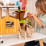 This hospital on stilts offers a wealth of play possibilities thanks to its multiple action zones : a landing platform with a helicopter for emergencies, an examination table for treatments, a secure enclosure for animals, a suspended rope bridge leading to a large baobab tree , and a ladder to access the different levels. A cleverly designed setting to encourage stories of exploration and rescue.